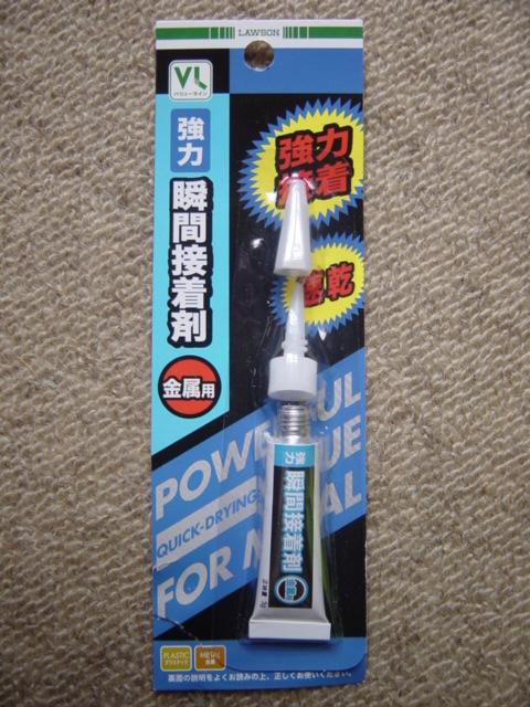 ↓100円ローソンで購入した瞬間接着剤。100円なのに量が多い。これでガイドとロッドを接着、接合します。